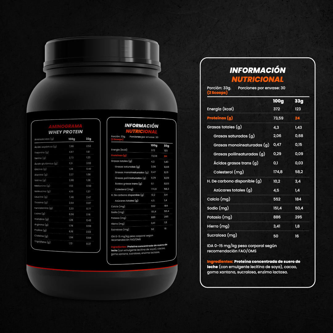 30 porciones | 24 g de proteína por servicio | 5,1 g de BCAA | 2,5 g de leucina